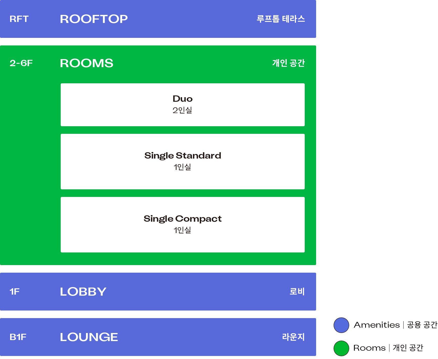 여섯 개 층으로 이루어진 맹그로브 숭인은 10개의 다양한 공용 공간과 23실의 개인 공간으로 구성되어 있습니다.